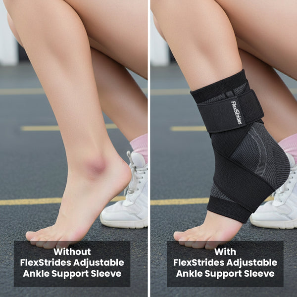 FlexStrides Adjustable Ankle Support Sleeve, your all-day solution for comfort, support, and pain relief.